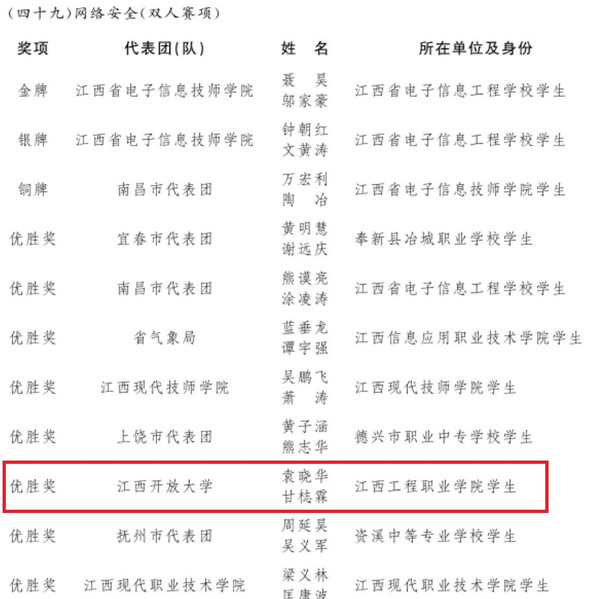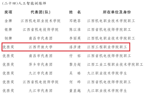 近日,江西省人民政府发布《江西省人民政府关于表扬江西省第一届职业技能大赛获奖选手、竞赛优秀指导老师和为参赛作出突出贡献单位的通报》(赣府字〔2023〕8号),江西省人力资源和社会保障厅发布《江西省人力资源和社会保障厅等五部门关于2022年江西省职业技能竞赛有关人员授予荣誉、颁发职业技能等级证书等事项的通报》(赣人社字〔2023〕178号),对获奖选手、单位等进行奖励。永利官网智能技术学院教师漆彦清荣获“人工智能训练师”赛项第四名,并被授予“江西省技术能手”“江西省青年岗位能手”“江西省巾帼建功标兵”荣誉称号;智能技术学院学生在“网站设计与开发”、“网络安全”赛项中荣获优胜奖两项。