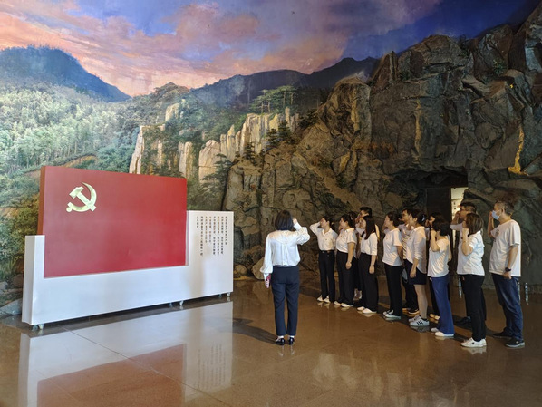 在到达新四军军部旧址陈列馆后,学院副院长、教师党支部书记刘群带领教师党员面对鲜红的党旗,郑重举起右手庄严宣誓,重温了入党誓词。
