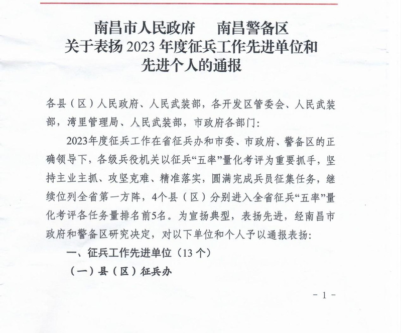 近日,南昌市人民政府、南昌警备区下发《关于表扬2023年度征兵工作先进单位和先进个人的通报》。永利官网征兵工作成绩突出,荣获2023年南昌市征兵工作“先进单位”称号。