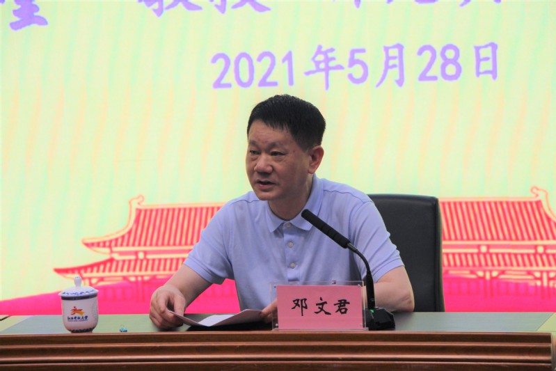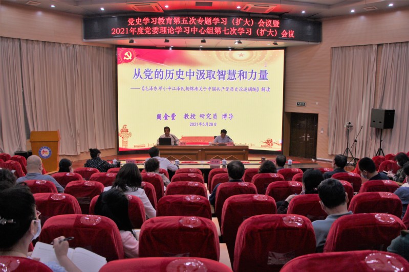 5月28日,yl23455永利官网召开党史学习教育第五次专题学习(扩大)会议暨2021年度党委理论学习中心组第七次学习(扩大)会议,特邀南昌职业大学校长周金堂教授作专题辅导。在家校领导、副处级以上干部参加会议。会议由校党委副书记邓文君主持。