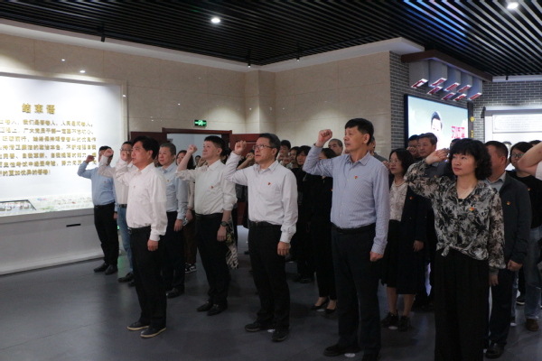 在入党誓词墙前,贺瑞虎举起右拳,带领大家重温入党誓词。