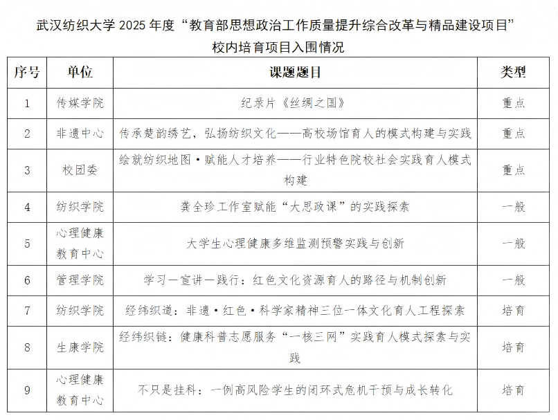 经自主申报、校外专家两轮评审、校党委审定,现将入围课题名单予以公示。公示时间为2025年10月9日至10月14日。公示期内,如有异议,请以书面形式反映,并提供必要的证据材料,以便核实查证。宣传部邮箱地址:xcb@wtu.edu.cn,纪委综合室邮箱地址:jw@wtu.edu.cn。
