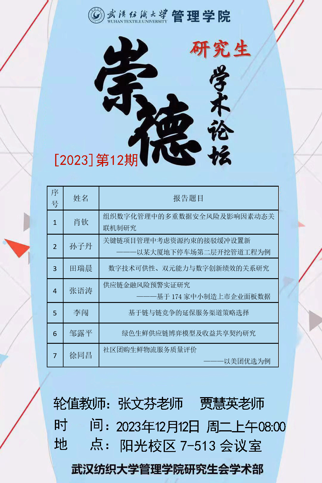 学术预告:第495期研究生学术论坛暨管理学院2023年第12期研究生学术论坛