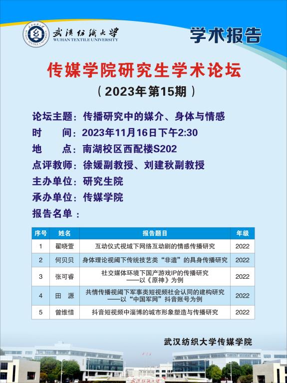 学术预告: 第410期研究生学术论坛暨传媒学院2023年第15期研究生学术论坛