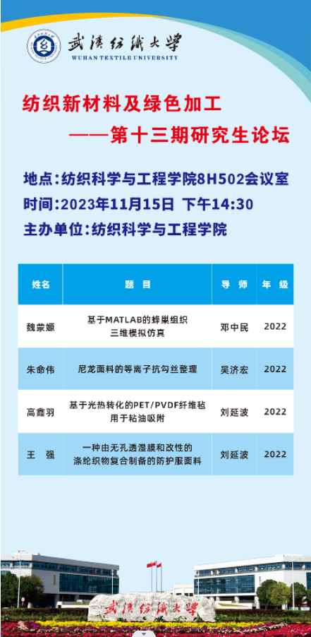 学术预告: 第411期研究生学术论坛暨纺织科学与工程学院2023年第5期研究生学术论坛