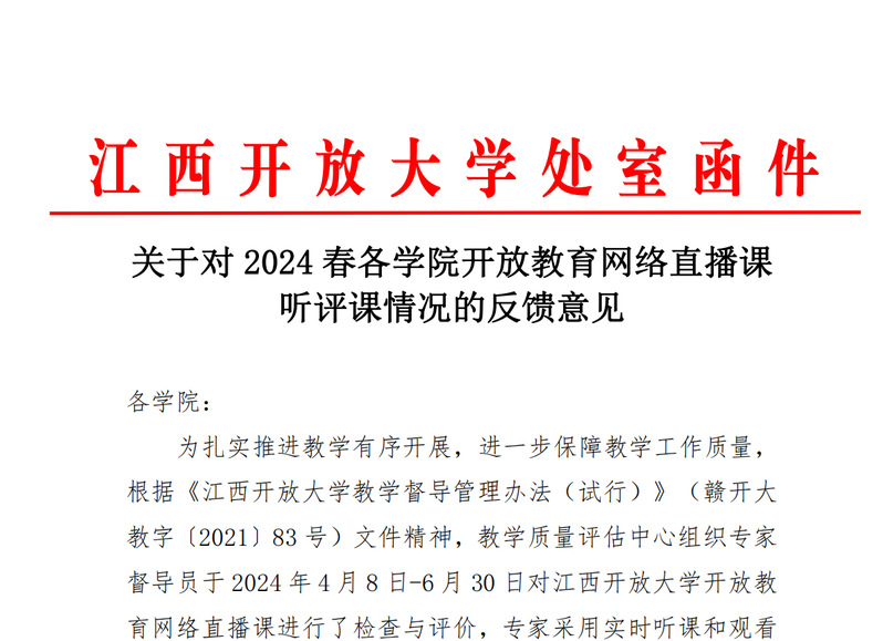 关于对2024春各学院开放教育网络直播课听评课情况的反馈意见