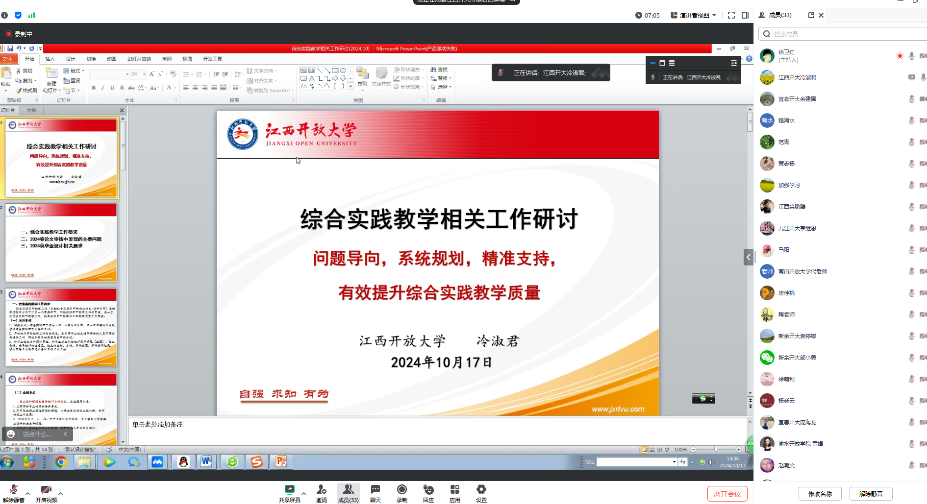 他指出,此次会议是面向全省开放大学办学体系召开的专业教学工作集中研讨会,是为迎接国开评估“回头看”工作,及时传达国家开放大学、江西省高校师资培训中心等专业课程培训的有关精神及落实综合实践环节指导教师培训要求下召开的研讨会。此次会议共有综合实践环节指导教师培训、课程思政优秀案例展示、优秀网络教学团队经验分享、虚拟实训平台专题培训、专业建设及课程教学改革经验交流等5项议程。他强调,希望通过此次会议能够进一步加强全省开放大学办学体系教师队伍联系,进一步提升教师队伍的整体能力素质和教育教学水平,确保教育事业得到高质量发展。