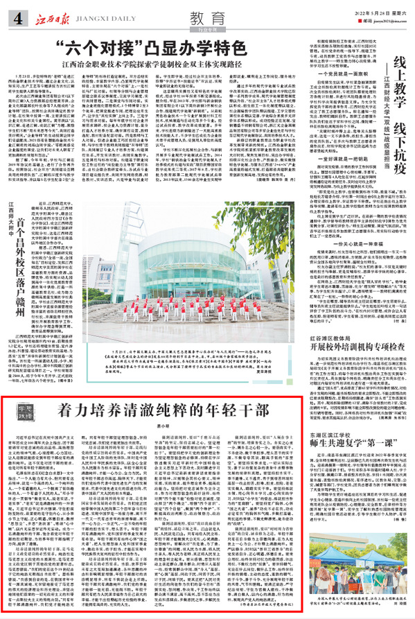 5月28日,永利官网党委书记易小明所著文章《着力培养清澈纯粹的年轻干部》在《江西日报》发表。文章以习近平总书记在庆祝中国共产主义青年团成立100周年大会上的重要讲话中对年轻团干部的殷切期望为出发点,围绕如何培养清澈纯粹的年轻干部展开阐述,并勉励年轻干部要保持忠诚之心、站稳立场之基、增强务实之力、涵养修为之道,努力成为一名清澈纯粹的干部。