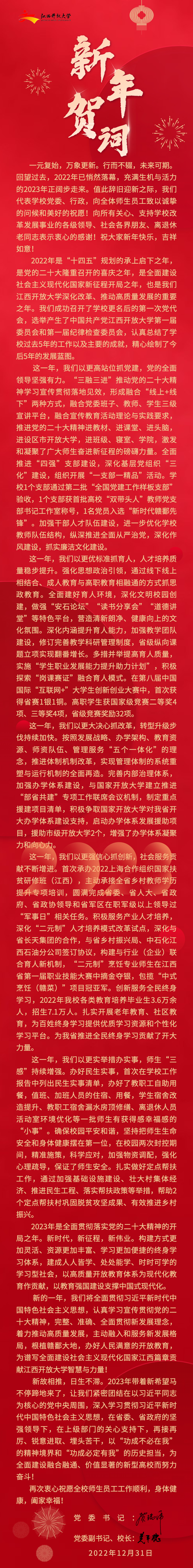 一元复始,万象更新。行而不辍,未来可期。回望过去,2022年已悄然落幕,充满生机与活力的2023年正阔步走来。值此辞旧迎新之际,我们代表学校党委、行政,向全体师生员工致以诚挚的问候和美好的祝愿!向所有关心、支持学校改革发展事业的各级领导、社会各界朋友、离退休老同志表示衷心的感谢!祝大家新年快乐,吉祥如意!