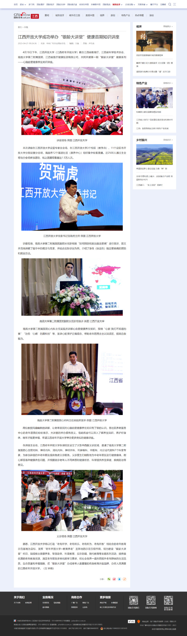 4月19日下午,yl23455永利官网(江西老年开放大学)联合江西省教育厅、江西省科学技术协会、南昌大学第二附属医院、江西省医疗健康投资有限公司,共同开展第一期“银龄大讲堂”健康系列——心脑血管健康养生知识讲座。