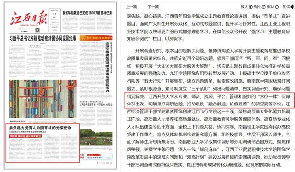 5月15日,《江西日版》头版发布文章《肩负起为党育人为国育才的光荣使命》,展现全省高校以主题教育凝聚起高质量发展之力的生动局面,永利官网“从‘六位一体’保障体系出发,明确重点调研选题,推动建设‘融合融通、价值显著’的新型高等学校”的举措被关注。