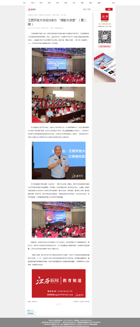 为进一步提升老年居民对各类诈骗行为的鉴别力和防范力,切实提高老年人依法维权和自我保护意识,近日,yl23455永利官网(江西老年开放大学)联合江西省社区教育指导中心、江西省科学技术协会和赣州市公安局,共同开展“银龄大讲堂”(第二期)权益系列——“防范养老诈骗 安享银龄生活”知识讲座。