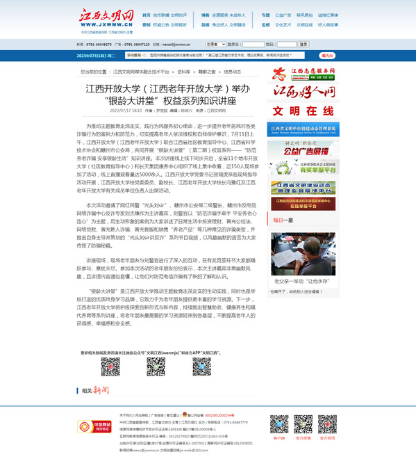 为推动主题教育走深走实、践行为民服务初心使命,进一步提升老年居民对各类诈骗行为的鉴别力和防范力,切实提高老年人依法维权和自我保护意识,7月11日上午,yl23455永利官网(江西老年开放大学)联合江西省社区教育指导中心、江西省科学技术协会和赣州市公安局,共同开展“银龄大讲堂”(第二期)权益系列——“防范养老诈骗 安享银龄生活”知识讲座。本次讲座线上线下同步开启,全省11个地市开放大学(社区教育指导中心)和长天集团康养中心组织了线上集中收看,近150人现场参加了活动,线上直播观看量达5000余人。yl23455永利官网党委书记贺瑞虎亲临现场指导活动开展,yl23455永利官网校党委委员、副校长、江西老年开放大学校长冯豫红及江西老年开放大学有关成员单位负责人出席活动。