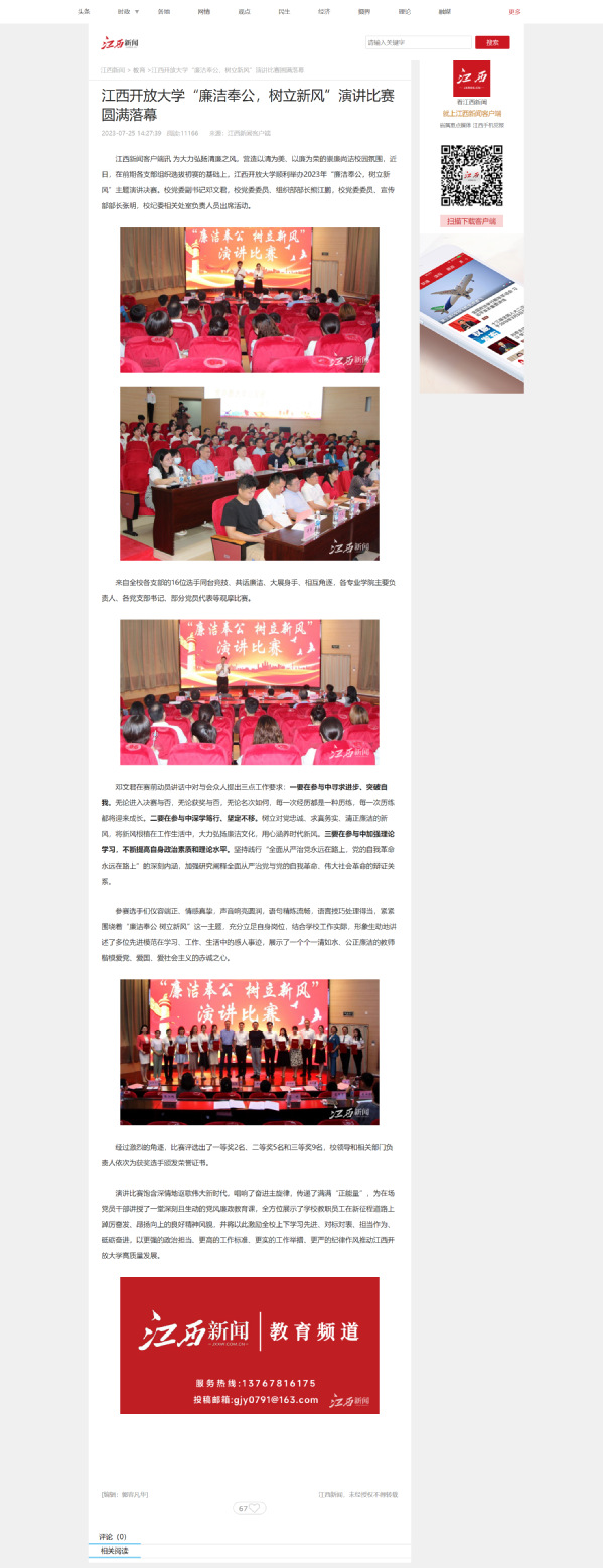 江西新闻客户端讯 为大力弘扬清廉之风,营造以清为美、以廉为荣的崇廉尚洁校园氛围,近日,在前期各支部组织选拔初赛的基础上,yl23455永利官网顺利举办2023年“廉洁奉公,树立新风”主题演讲决赛。校党委副书记邓文君,校党委委员、组织部部长熊江鹏,校党委委员、宣传部部长张明,校纪委相关处室负责人员出席活动。