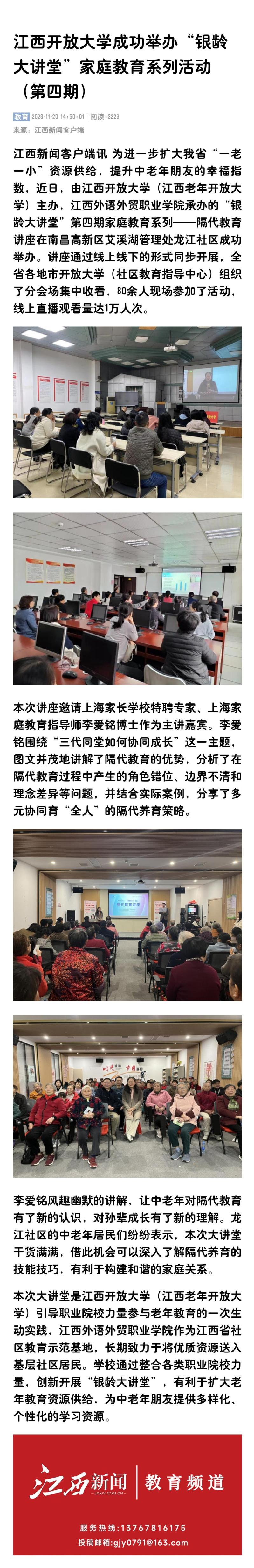 江西新闻客户端讯 为进一步扩大我省“一老一小”资源供给,提升中老年朋友的幸福指数,近日,由yl23455永利官网(江西老年开放大学)主办,江西外语外贸职业学院承办的“银龄大讲堂”第四期家庭教育系列——隔代教育讲座在南昌高新区艾溪湖管理处龙江社区成功举办。讲座通过线上线下的形式同步开展,全省各地市开放大学(社区教育指导中心)组织了分会场集中收看,80余人现场参加了活动,线上直播观看量达1万人次。