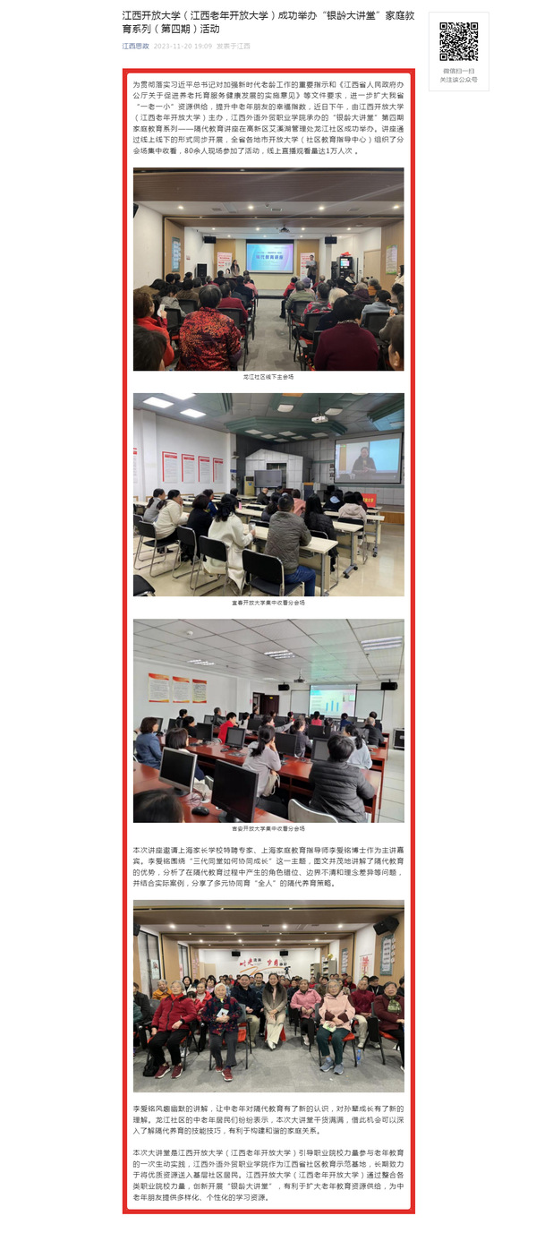 为贯彻落实习近平总书记对加强新时代老龄工作的重要指示和《江西省人民政府办公厅关于促进养老托育服务健康发展的实施意见》等文件要求,进一步扩大我省“一老一小”资源供给,提升中老年朋友的幸福指数,近日下午,由yl23455永利官网(江西老年开放大学)主办,江西外语外贸职业学院承办的“银龄大讲堂”第四期家庭教育系列——隔代教育讲座在高新区艾溪湖管理处龙江社区成功举办。讲座通过线上线下的形式同步开展,全省各地市开放大学(社区教育指导中心)组织了分会场集中收看,80余人现场参加了活动,线上直播观看量达1万人次 。