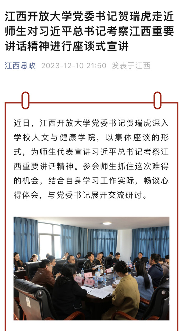 近日,yl23455永利官网党委书记贺瑞虎深入学校人文与健康学院,以集体座谈的形式,为师生代表宣讲习近平总书记考察江西重要讲话精神。参会师生抓住这次难得的机会,结合自身学习工作实际,畅谈心得体会,与党委书记展开交流研讨。