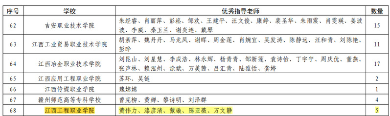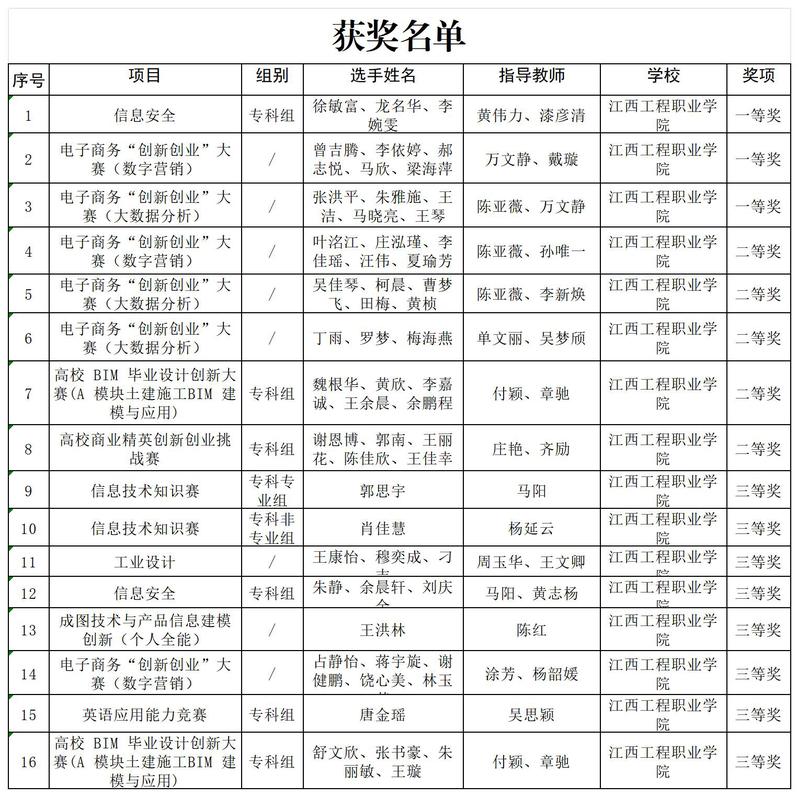 2023年江西省大学生科技创新竞赛中,学校在信息安全、工业设计、信息技术知识、BIM毕业设计、成图技术与产品信息建模、商业精英创新创业、电子商务“创新创业”、英语应用能力等多个项目中获奖16项。其中一等奖3个,二等奖5个,三等奖8个;黄伟力、漆彦青、戴璇、陈亚薇、万文静等5名教师获“优秀指导教师”荣誉称号;学校在信息安全(专科组)竞赛项目中获得团体总分第三名。