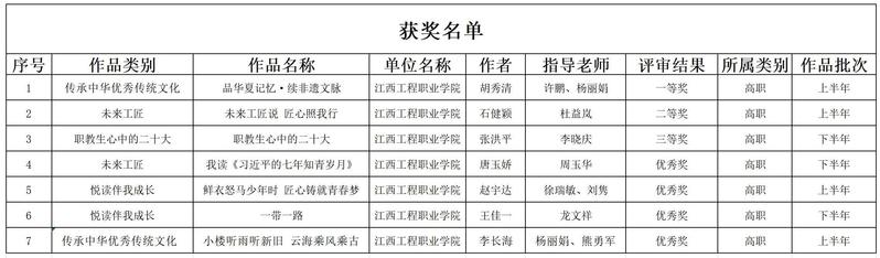 近日,江西省2023年职业学校“技能成才 强国有我”系列教育活动公布获奖结果。活动共分为5大类项目,分别是“职教生心中的二十大”“未来工匠”“悦读伴我成长”“传承中华优秀传统文化”“文明风采”。永利官网共有7个作品在4个作品类别中获奖,其中一等奖1项,二等奖1项,三等奖1项,优秀奖4项。