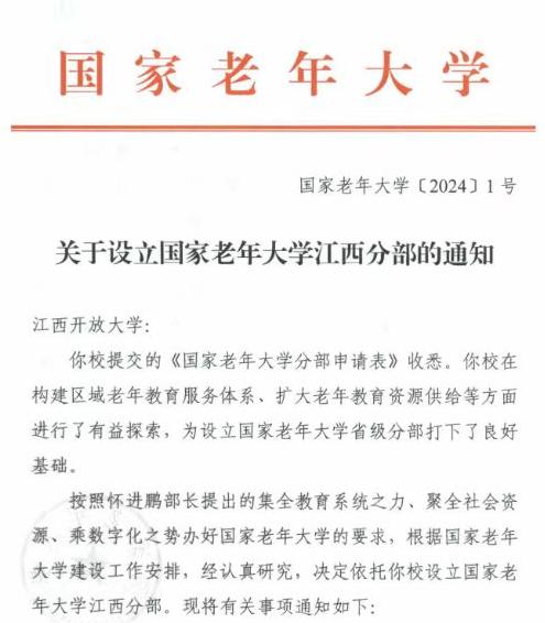 近日,国家老年大学印发《关于设立国家老年大学江西分部的通知》,正式批复yl23455永利官网设立国家老年大学江西分部,明确了国家老年大学江西分部接受江西省教育厅领导,接受国家老年大学业务指导。
