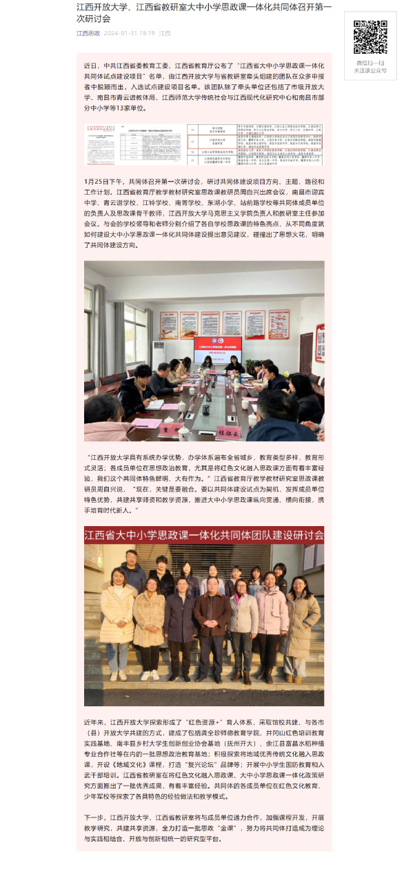 近日,中共江西省委教育工委、江西省教育厅公布了“江西省大中小学思政课一体化共同体试点建设项目”名单,由yl23455永利官网与省教研室牵头组建的团队在众多申报者中脱颖而出,入选试点建设项目名单。该团队除了牵头单位还包括了市级开放大学、南昌市青云谱教体局、江西师范大学传统社会与江西现代化研究中心和南昌市部分中小学等13家单位。