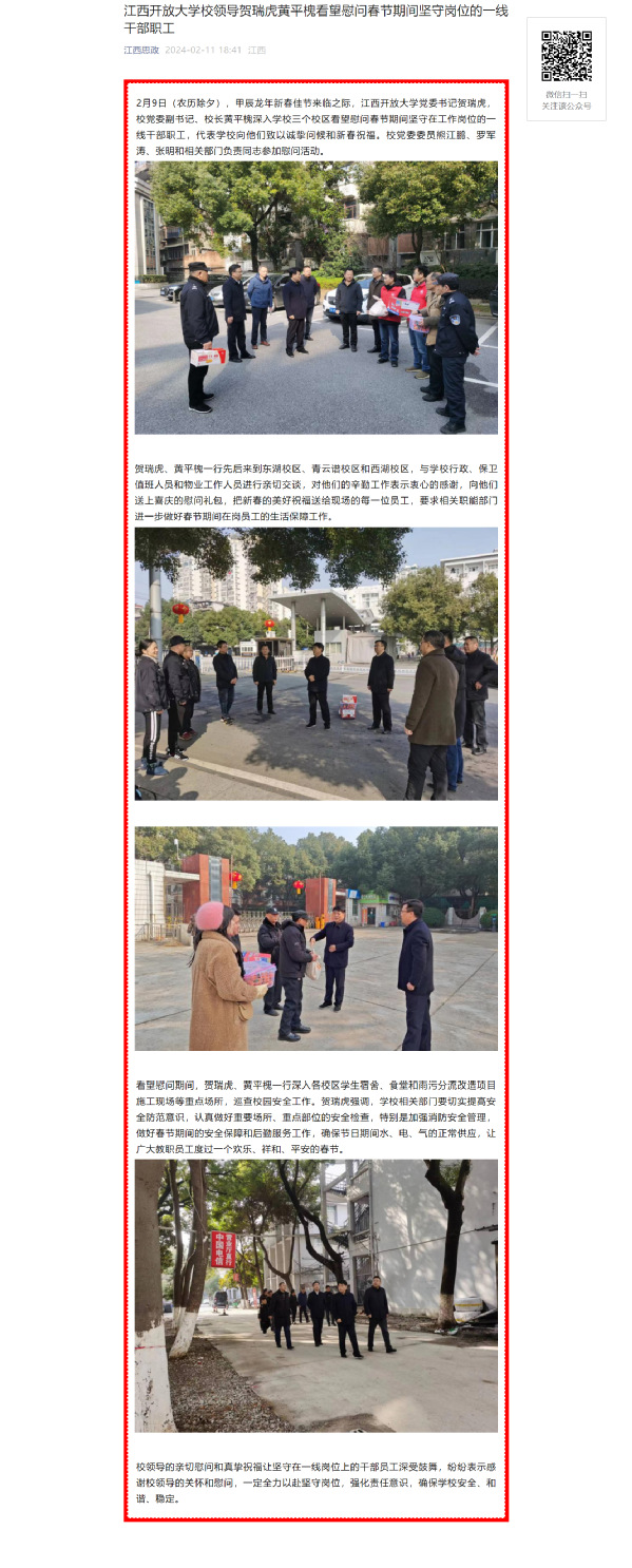2月9日(农历除夕),甲辰龙年新春佳节来临之际,yl23455永利官网党委书记贺瑞虎,校党委副书记、校长黄平槐深入学校三个校区看望慰问春节期间坚守在工作岗位的一线干部职工,代表学校向他们致以诚挚问候和新春祝福。校党委委员熊江鹏、罗军涛、张明和相关部门负责同志参加慰问活动。