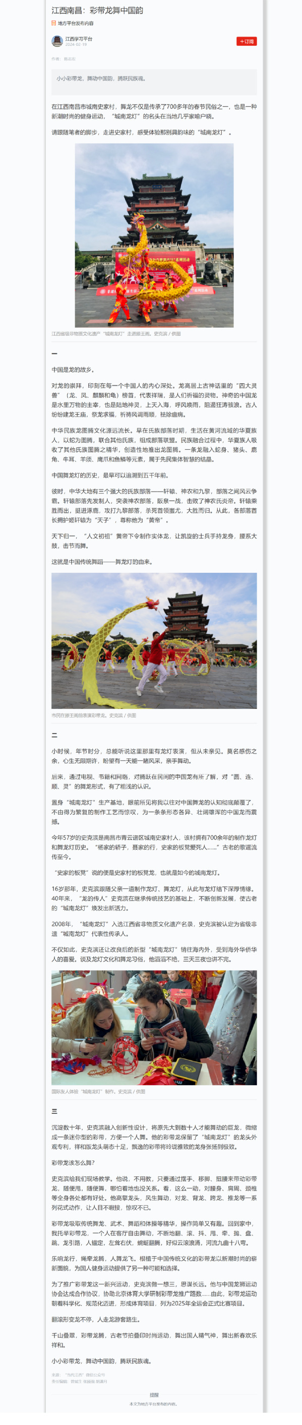 在江西南昌市城南史家村,舞龙不仅是传承了700多年的春节民俗之一,也是一种新潮时尚的健身运动,“城南龙灯”的名头在当地几乎家喻户晓。近日,学习强国刊登永利官网教师陈志宏文章《彩带龙舞中国韵》。原文地址:https://article.xuexi.cn/articles/index.html?art_id=17997707996819775995&cdn=https%3A%2F%2Fregion-jiangxi-resource&item_id=17997707996819775995&study_style_id=feeds_opaque&t=1708339374627&showmenu=false&ref_read_id=0b63e686-a9b0-4e72-ac27-82ea86c8ed27_1708393370628&pid=&ptype=-1&source=share&share_to=wx_single (责任编辑:罗楚颖)