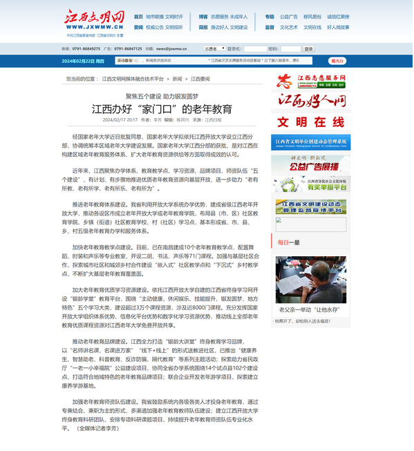 经国家老年大学近日批复同意,国家老年大学拟依托yl23455永利官网设立江西分部,协调统筹本区域老年大学建设发展。国家老年大学江西分部的获批,是对江西在构建区域老年教育服务体系、扩大老年教育资源供给等方面取得成效的认可。