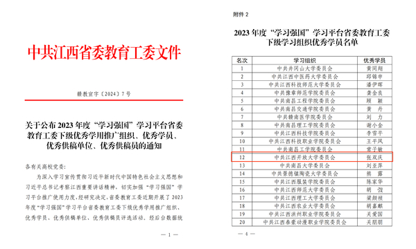 这次评选结果是对学校抓深抓实理论武装的一次充分肯定,希望获评的先进典型珍惜荣誉、再接再厉,着力发挥模范带动和示范引领作用。学校也将以此次评选活动为契机,持续加强“学习强国”学习平台的推广使用工作,引导广大党员干部深入学习贯彻习近平新时代中国特色社会主义思想,全面讲好江西教育故事、传播好江西教育声音、展示好江西教育形象,为奋力谱写中国式现代化建设江西教育篇章提供坚强思想保证和强大精神力量。(供稿:宣传部 编辑:罗楚颖 责编:张睿)