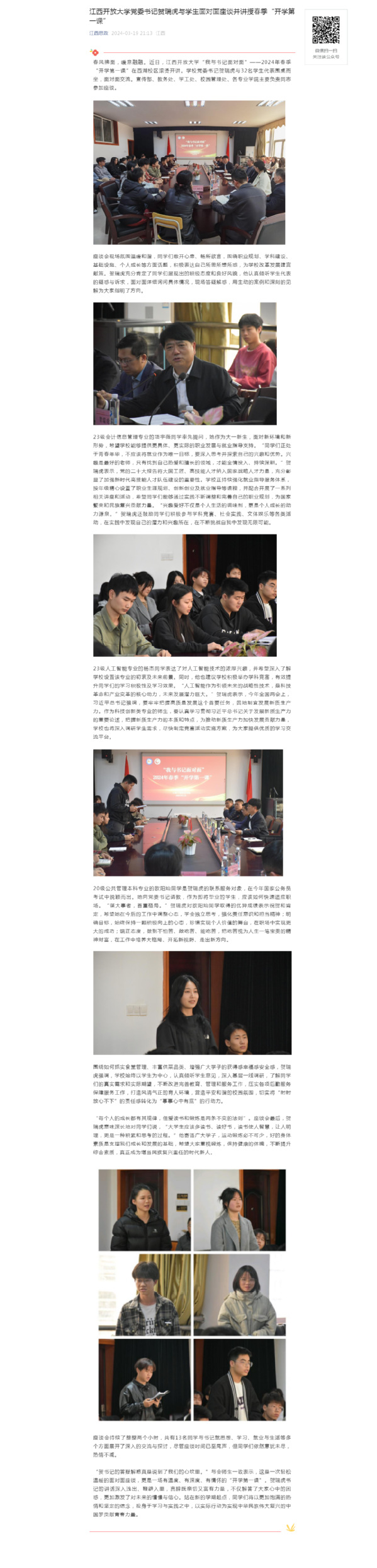 春风拂面,暖意融融。近日,yl23455永利官网“我与书记面对面”——2024年春季“开学第一课”在西湖校区滚烫开讲。学校党委书记贺瑞虎与32名学生代表围桌而坐,面对面交流。宣传部、教务处、学工处、校园管理处、各专业学院主要负责同志参加座谈。