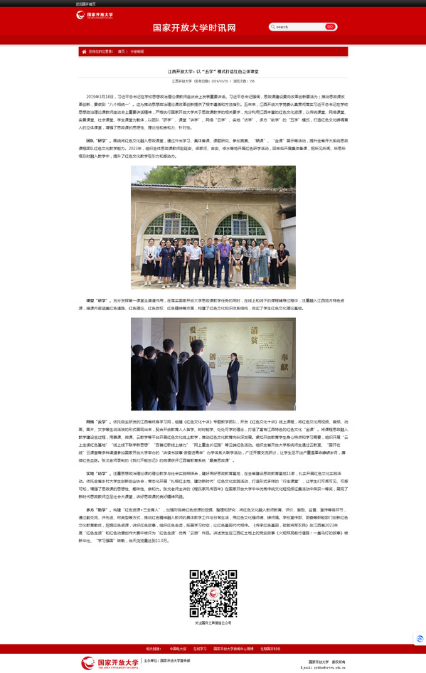 2019年3月18日,习近平总书记在学校思想政治理论课教师座谈会上发表重要讲话。习近平总书记强调,思政课建设要向改革创新要活力;推动思政课改革创新,要做到“八个相统一”。这为推动思想政治理论课改革创新提供了根本遵循和方法指引。五年来,yl23455永利官网党委认真贯彻落实习近平总书记在学校思想政治理论课教师座谈会上重要讲话精神,严格执行国家开放大学关于思政课教学的相关要求,充分利用江西丰富的红色文化资源,以传统课堂、网络课堂、实景课堂、社会课堂、学生课堂为载体,以团队“研学”、课堂“讲学”、网络“云学”、实地“访学”、多方“助学”的“五学”模式,打造红色文化铸魂育人的立体课堂,增强了思政课的思想性、理论性和亲和力、针对性。
