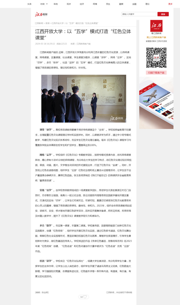 近期,yl23455永利官网党委充分利用江西丰富的红色文化资源,以传统课堂、网络课堂、实景课堂、社会课堂、学生课堂为载体,以课堂“讲学”、网络“云学”、实地“访学”、多方“助学”、社团“送学”的“五学”模式,打造红色文化铸魂育人的立体课堂,增强了思政课的思想性、理论性和亲和力、针对性。