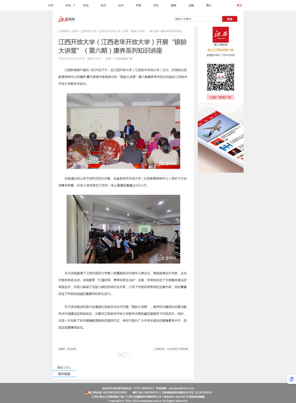 3月20日下午,由yl23455永利官网(江西老年开放大学)主办,东湖区社区教育指导中心和康桥·嘉元草堂中医馆承办的“银龄大讲堂”第六期康养系列知识讲座在江西老年开放大学教学点举办。