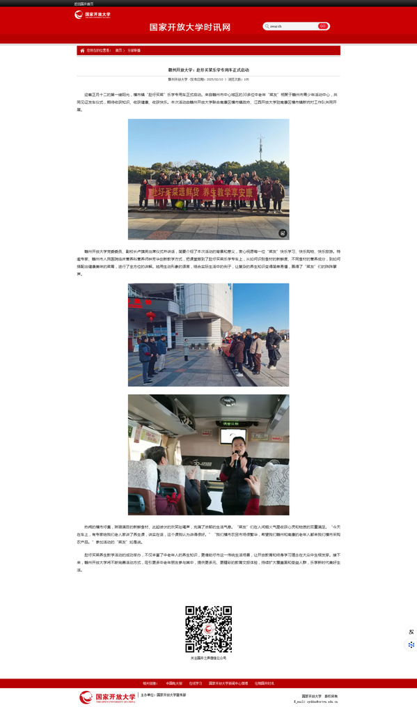 迎着正月十二的第一缕阳光,横市镇“赴圩买菜”乐学专用车正式启动。来自赣州市中心城区的30多位中老年“菜友”相聚于赣州市青少年活动中心,共同见证发车仪式,期待收获知识、收获健康、收获快乐。本次活动由赣州开放大学联合南康区横市镇政府、yl23455永利官网驻南康区横市镇新坑村工作队共同开展。